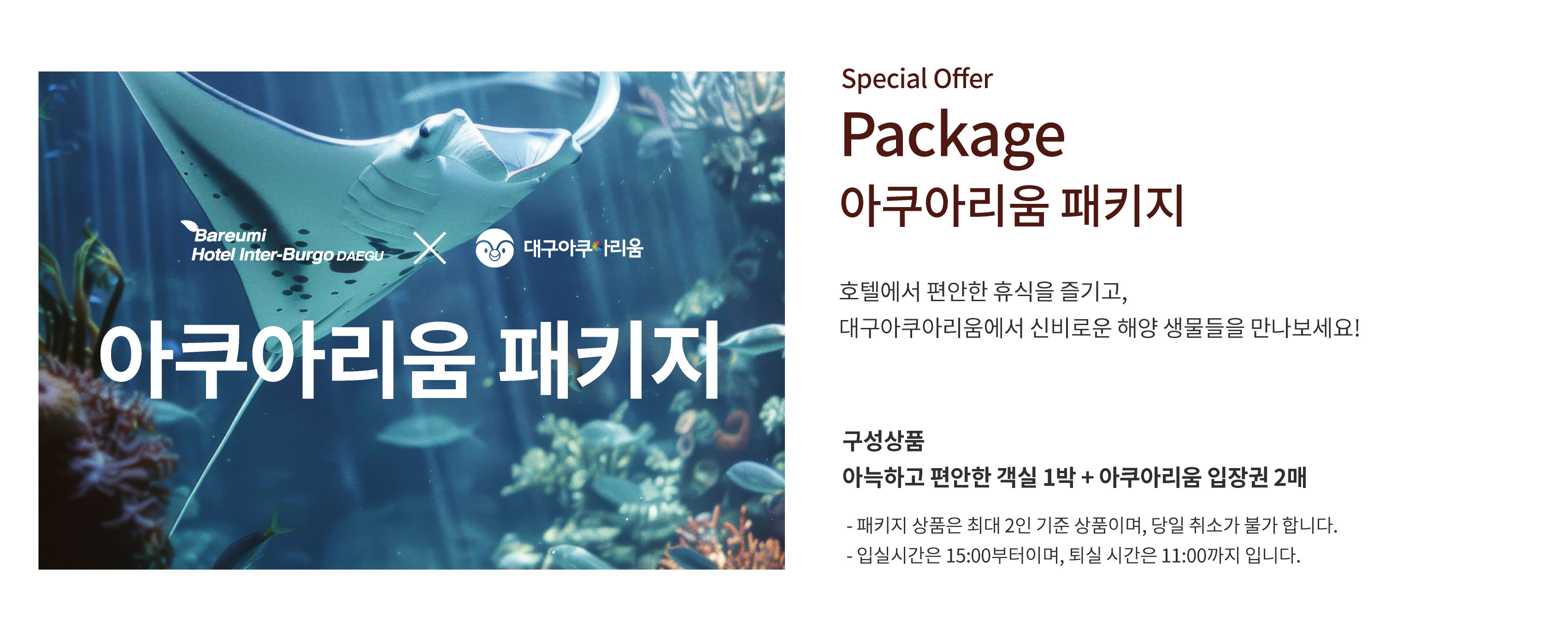 운영시간 평일 10:30 ~ 20:00 / 주말,공휴일 10:30 ~ 20:30 (입장마감 19:00) 아쿠아리움 문의 : 053-247-8899