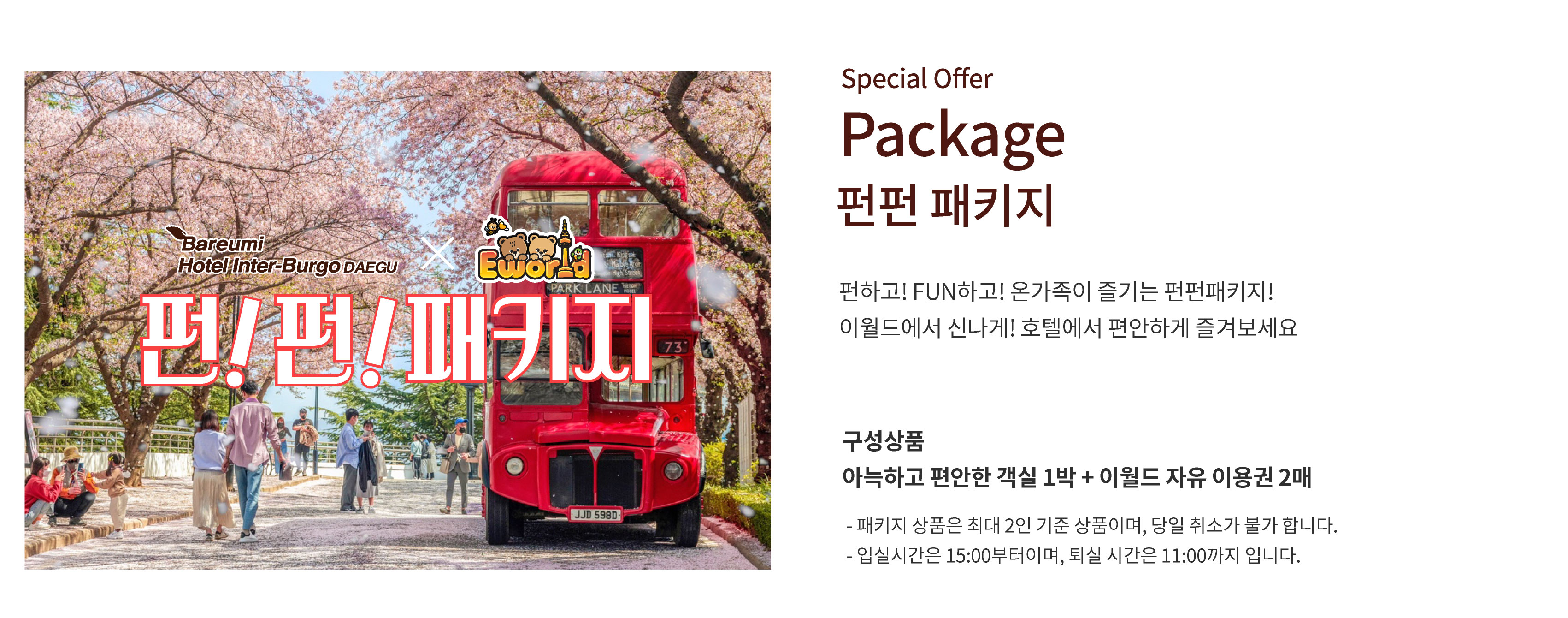 ![]() ■ 이월드 자유이용권 2매 포함 * 운영시간 10:00 ~ 22: 00 ( 상기 일정은 내부 사정에 따라 변경 될 수 있습니다.) ===> 이월드 공식 홈페이지 참조 (https://eworld.kr) * 이월드 문의 : 070 - 07549 - 8112 * 쿠폰 수령 : 모바일 티켓 (쿠폰 수령 : 체크인 시 프런트 발급 )